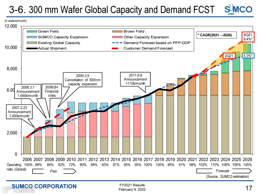 根据SEMI数据,全球市场对12寸硅片的需求量持续上涨,硅片由8寸向12寸转移的趋势明显。大尺寸硅片可提升生产效率及成品率(12寸比8寸的单片硅片可生产芯片数量提升2.64倍),降低生产成本(12寸比8寸的平摊单片芯片的加工成本以及时间成本减少约30%),提升设备的重复利用率。根据SUMCO预测,2026年全球12寸硅片需求量将达到1100万片/月,CAGR为8.4%。
