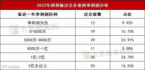 在披露2021年净利润年报的496家过会企业中,科创板过会121家企业,占比24.40%。科创板过会企业最近一年的平均净利润为1.06亿元,净利润中位数为8155.85万元,净利润小于5000万且为正有19家,占比15.70%,净利润最高值为17.29亿元,最低值为-12.36亿元。