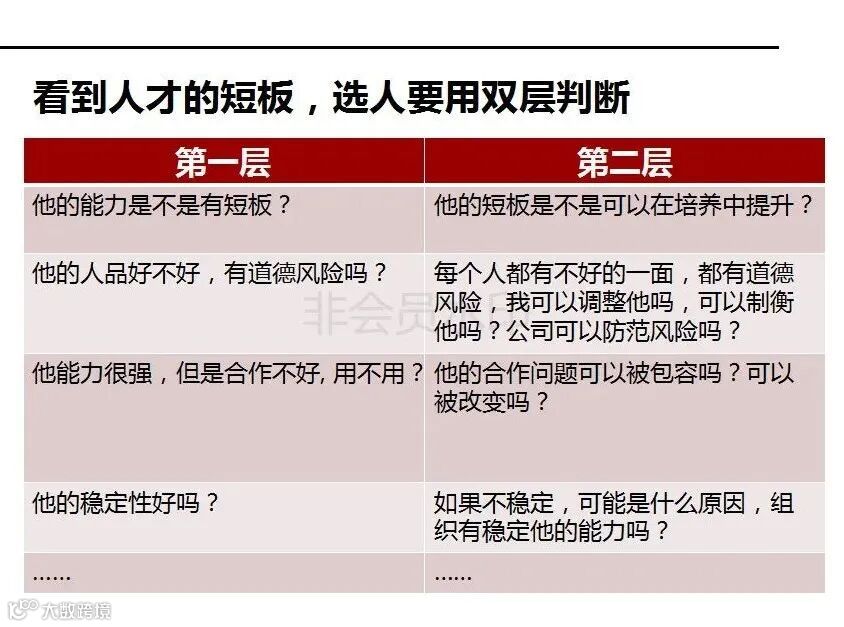 3. 不清楚人才背后的要素标准,就难以看懂人才“质地”“时态”,看不懂人才的表现是偶然的还是必然的,是容易改变的还是不容易改变的,选人的时候,会过高期待实力人才或者错失潜力人才。
