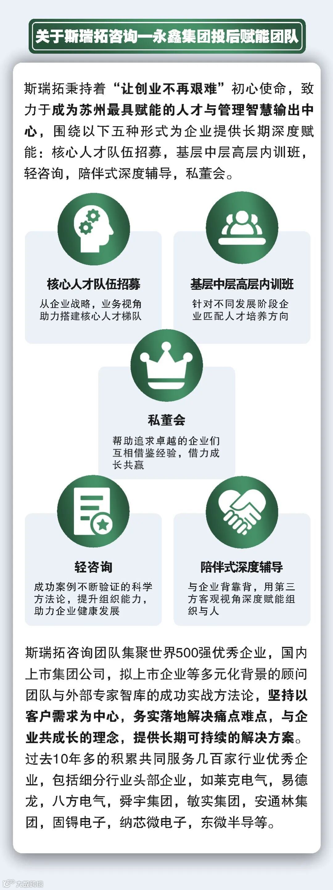 永鑫集团旗下斯瑞拓咨询作为苏州专业人力资源咨询公司,为企业寻找、对接和招聘专业人才,帮助搭建核心人才梯队,从组织发展、战略与业务角度为企业提供增值服务,成为客户最信赖的人才管理专家和合作伙伴,成为苏州最具有价值与影响力的HR赋能机构。