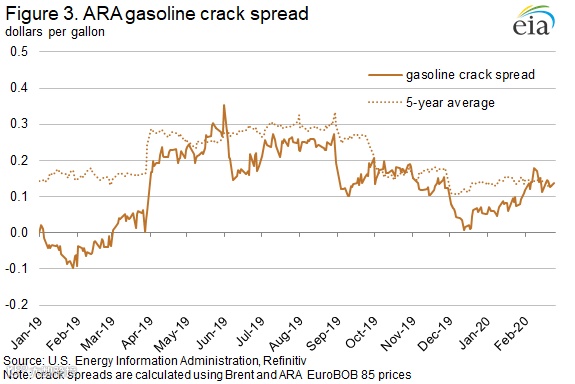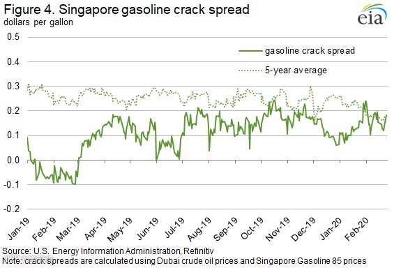 Crack spreads in Singapore were 14 cents/gal as of February 25, an increase of 1 cent/gal over the January crack spread (Figure 4). Gasoline prices in Singapore have averaged $1.46/gal so far in February, which is down by 20 cents/gal from January. The price for Dubai crude oil (the regional benchmark used for calculating crack spreads) averaged 22 cents/gal lower on February 25 compared with the January average, providing some upward pressure on crack spreads in Singapore. Because of its proximity to China, gasoline and crude oil prices in Singapore are likely more affected by demand concerns stemming from the 2019 novel coronavirus (COVID-19) than prices in Europe or the United States. Decreasing refinery runs in China, as reported by trade press articles, are likely putting downward price pressure on crude oil, offsetting the effects of crack spreads of falling gasoline prices. The effects of COVID–19 on petroleum markets is uncertain and continues to evolve.
