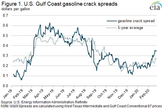 U.S. Gulf Coast gasoline crack spreads averaged 18 cents per gallon (gal) in January, compared with a five-year average of 22 cents/gal. Since 2010, only the crack spreads in 2015 and 2019 were smaller, when they averaged 12 cents/gal.
