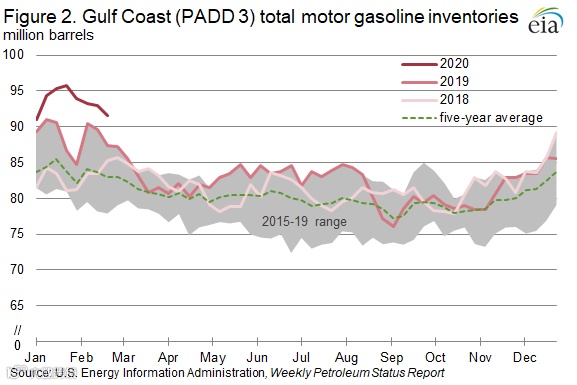 Weak gasoline consumption and strong refinery runs led to record-high gasoline inventories in early 2020. On January 24, 2020, weekly gasoline inventories reached 95.8 million barrels in the Gulf Coast (Petroleum Administration for Defense Districts, or PADD, 3) and 261.2 million barrels for the United States in total, both record highs (Figure 2).