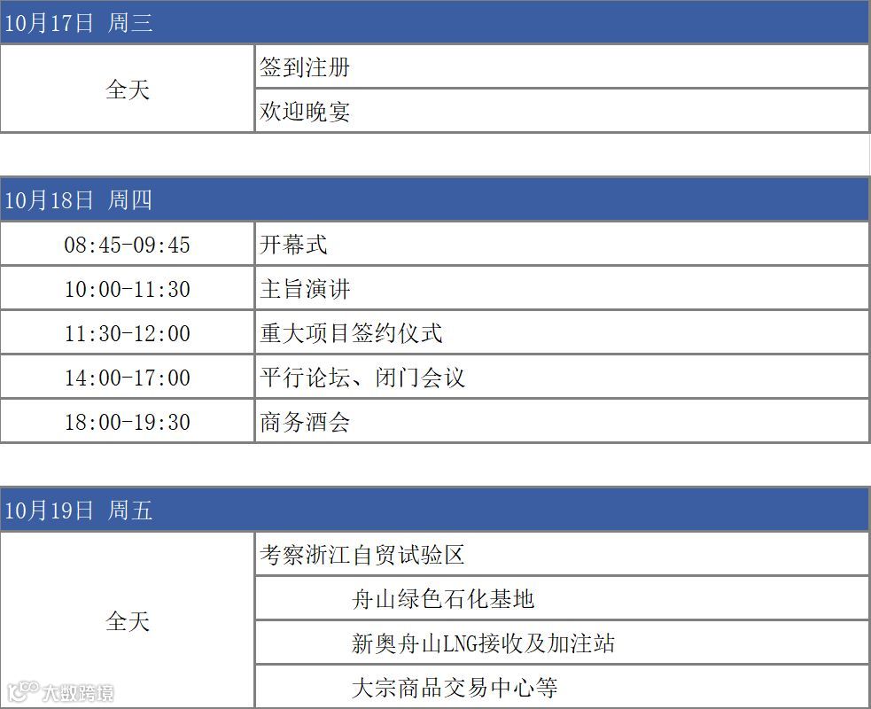 会议安排上突出浙江自贸试验区油品全产业链特色,结合区域特色,组织开展各类配套活动。嘉宾团将实地考察鱼山石化基地、新奥LNG、大宗商品交易中心、舟山海上花园城市建设……