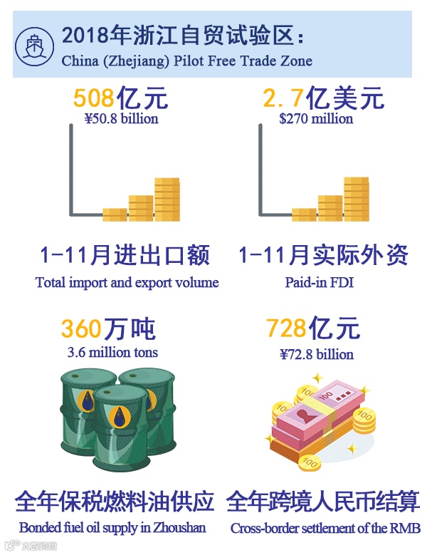 2018年,浙江开放平台作用不断凸显。1到11月,浙江自贸试验区实现进出口额508亿元,实际利用外资2.7亿美元。全年完成保税燃料油供应360万吨,跨境人民币结算728亿元。