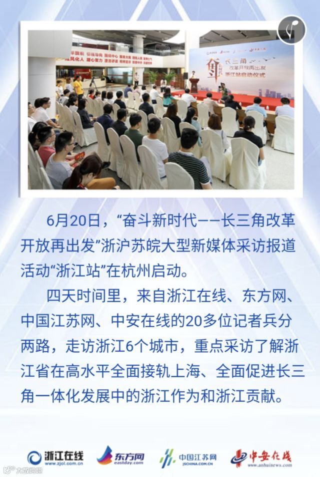 长三角地区是国内经济最具活力、开放程度最高、创新能力最强的区域之一,是“一带一路”和长江经济带的重要交汇点。6月,“奋斗新时代——长三角改革开放再出发”沪苏浙皖大型新媒体采访报道活动正式启动。在一个多月的时间里,三省一市网络媒体记者将走访长三角20多个城市,用媒体的力量见证长三角一体化的进程,推动长三角更高质量的一体化发展。