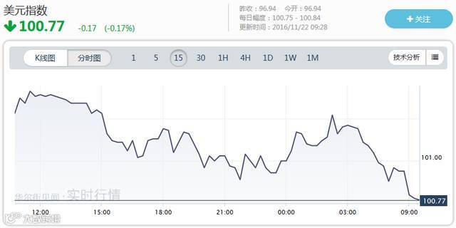 与人民币终值12连跌相对应的是,今日美元指数小幅走低,现跌0.17%至100.77。