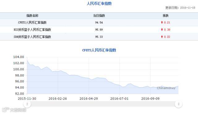 中国外汇交易中心数据显示,截至11月18日,CFETS人民币汇率指数为94.54,按周涨0.21%,较2014年底则仍跌5.46%。