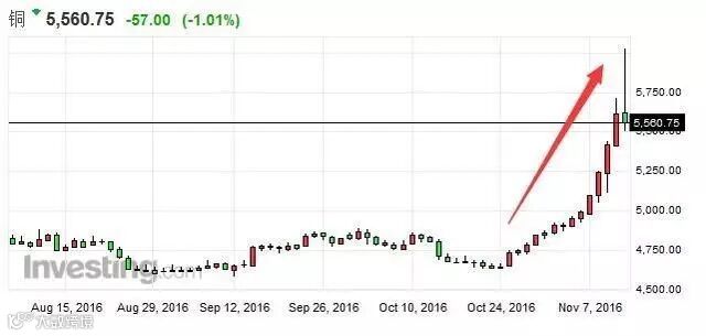 上周中国内盘铜价近期同样大涨。9日,上海期货交易所期铜收涨3%。10日,沪铜涨停收盘。11日,沪铜收涨8.68%,至每吨46700元/吨。