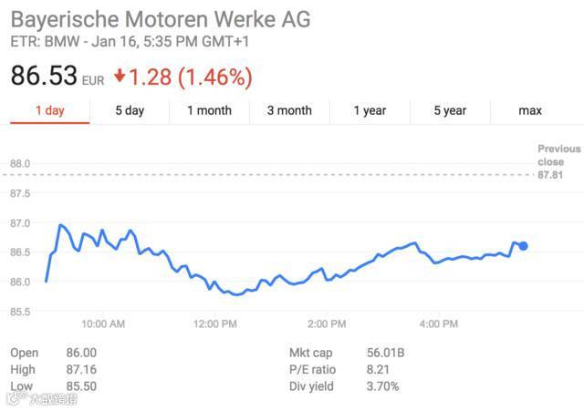 宝马股价在法兰克福股市盘中下跌1.46%,戴姆勒股价下跌1.54%,大众下跌1.07%。