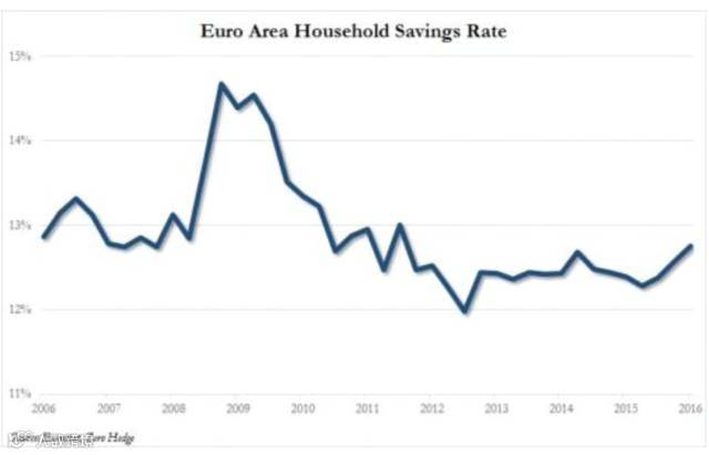 本周,Eurostat发布最新的欧元区季度储蓄率数据也许为这一观点提供了证明。最新数据显示,欧元区家庭总储蓄率在2016年第二季度达到12.8%,创下2011年三季度以来新高。负利率并没有推动储蓄下降,反而推高了家庭储蓄。