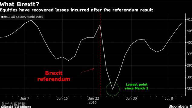 截至周二收盘,MSCI世界指数已经连续四个交易日上涨,累计涨幅达7.9%。全球范围内,英国公投结果公布后股市蒸发的3.5万亿美元市值,几乎已经全部收复。