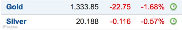 期金、期银周二收跌。COMEX 8月黄金期货跌1.67%,或22.65美元,报1333.95美元/盎司;期银价格跌0.57%,或0.116美元,报20.188美元/盎司。