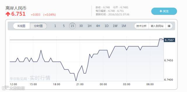 国庆过后的人民币贬值还在持续。离岸人民币对美元亚太早盘失守6.75关口,再创1月7日来新低。昨日在岸人民币兑美元夜盘小幅收跌,报6.7457元。