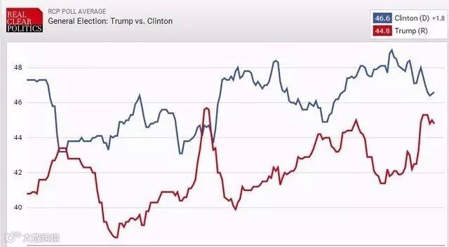 以下RealClearPolitics网站图表显示,截至当地时间上周日,希拉里民调平均支持率领先特朗普1.8个百分点。