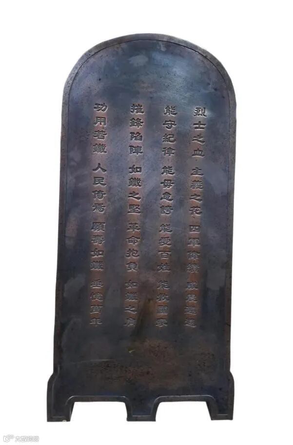 图为“铁军”盾牌,盾牌高1米,宽0.5米,重达数十斤,正面铸着“铁军”两个大字,用红漆漆过。铁盾牌的上款铸有“国民革命军第四军全体同志伟鉴”,下款是“民国十六年一月十五日武汉粤侨联谊社同人敬赠”。背面铸有四言体词一首:
