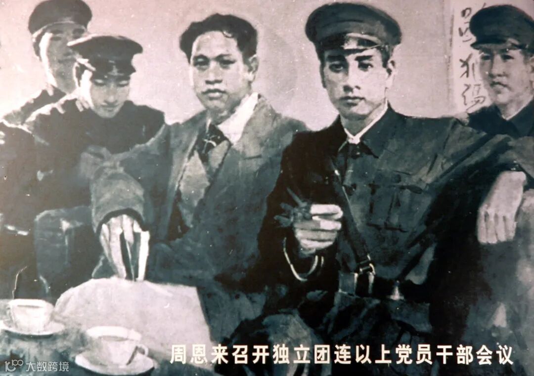 图为绘画记录周恩来召开独立团连以上党员干部会议。(1926年5月1日,叶挺率领独立团由肇庆、新会出发,在广州集结。周恩来代表中共广东区委,在广州叶家祠召集独立团连以上干部会议,做出重要指示,“要起先锋作用、模范作用、骨干作用;你们的任务很重要,一定要打胜仗”,最后用“饮马长江”激励独立团将士。)