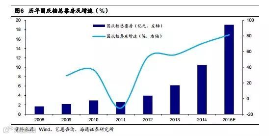 根据艺恩咨询的数据,2015年国庆黄金周期间,前6天票房总收入已达16.3亿元,7天票房总收入有望达到19.0亿元,较 14 年同期增长81.4%,较去年的70.2%再上台阶。2009年以来,全国国庆黄金周电影票房收入便持续高增长,并持续走高。这意味着文化娱乐消费正在成为居民节假日消费中的新亮点。