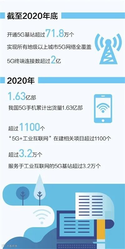 工业和信息化部1月26日发布的最新统计数据显示:我国已建成全球最大5G网络,截至2020年底,开通5G基站超过71.8万个,实现所有地级以上城市5G网络全覆盖,5G终端连接数超过2亿。