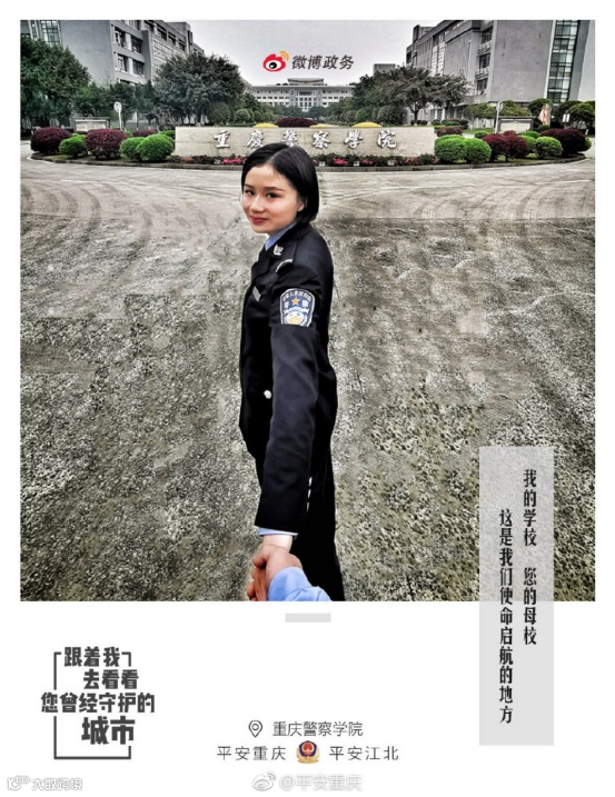 2010年,重庆民警陈泽在执行任务途中因公殉职。2019年清明,@平安重庆 突破常规哀悼英雄的宣传手法,给陈泽同志正在重庆警察学院读大三的女儿陈昊月拍摄了一组照片并制作成海报,用陈昊月虚拟牵手的图片表达女儿对父亲的思念,展现今天重庆的巨大改变,借此表现重庆公安继承英雄的遗志,时刻守护着这座他曾用生命守护的城市。
