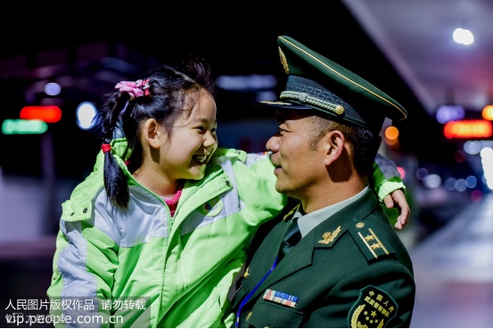 这是一次短暂而幸福的相聚。两年前,看着爸爸跟随改革强军的大潮远离驻地,如今已经6岁的她,和家人远赴广州火车站春运执勤一线,探望还在坚守岗位的父亲。据悉,这是小女孩第一次和父亲一起过年,在家人的记忆中,孩子出生后,爸爸由于任务繁重6年没有回家过春节。