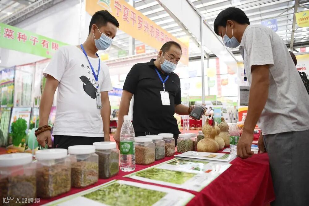 7月27日,第七届宁夏种业博览会在宁夏回族自治区石嘴山市平罗县种子小镇泰金种业产业园开幕。这是参会者在展览现场了解种子产品。新华社记者 王鹏 摄