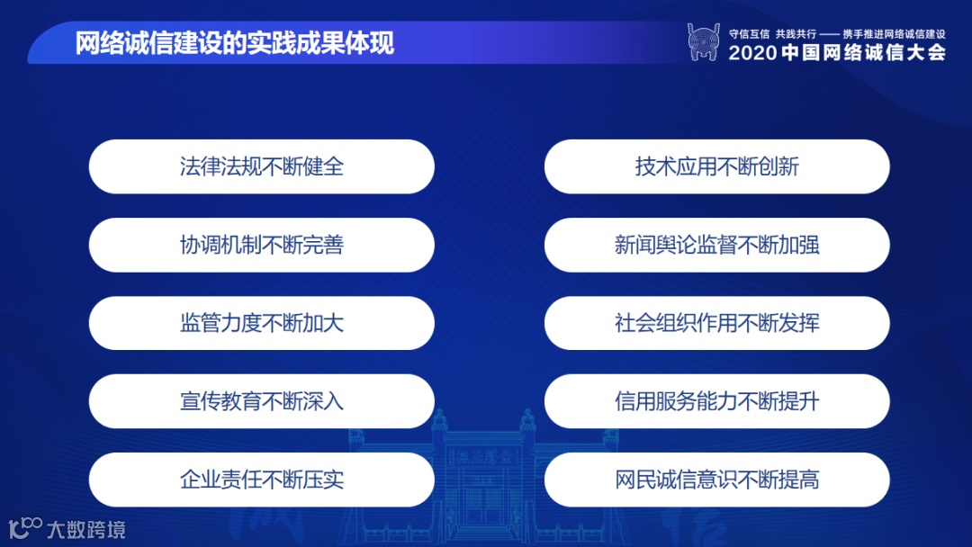 一是加强统筹,着力构建网络诚信建设体系。着力构建包含法规支撑、信用标准、诚信监管、行业自律、企业内控、社会监督等六大子系统的网络诚信建设体系。