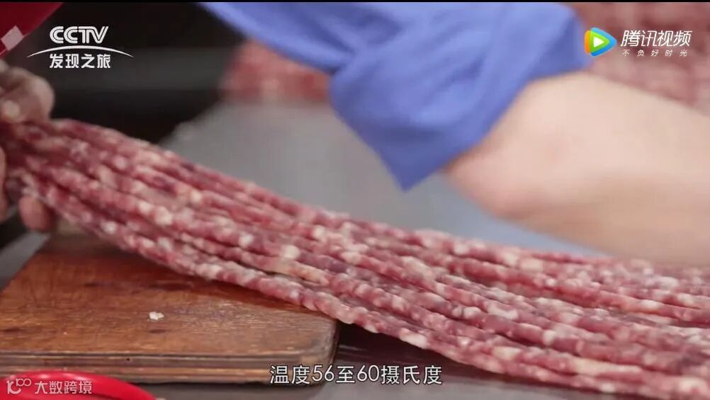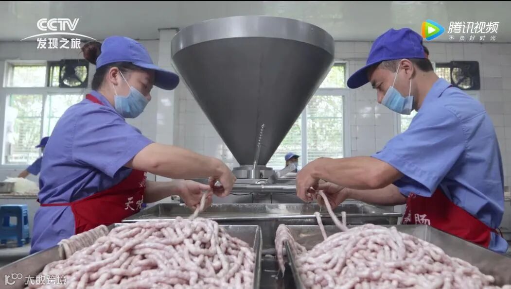 接下来我们看到环节是灌肠。顾名思义,就是把调配好的猪肉灌到肠衣里,这一进一出看似简单要一气呵成。