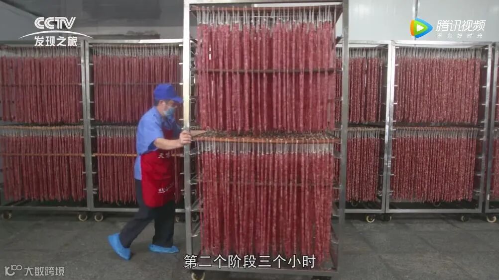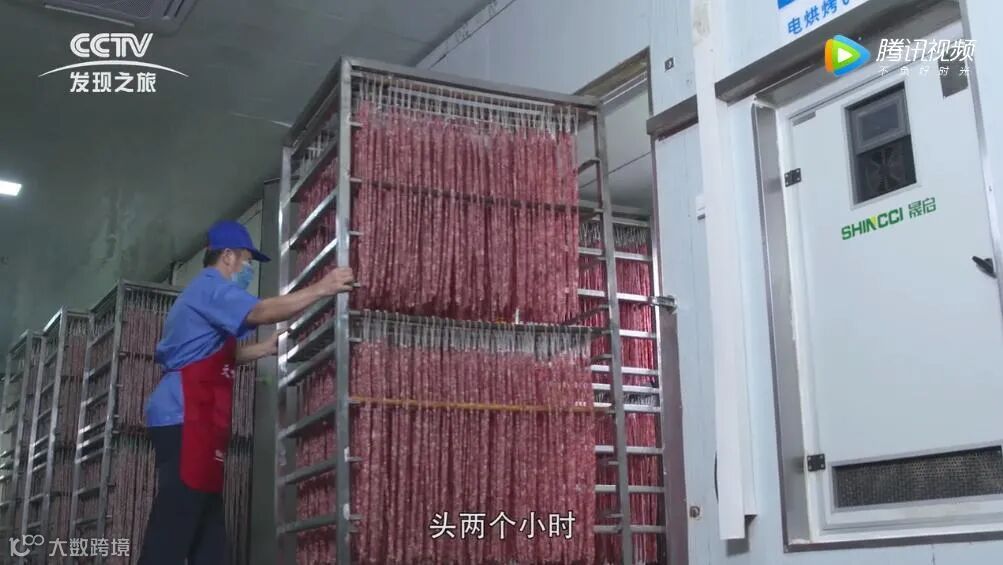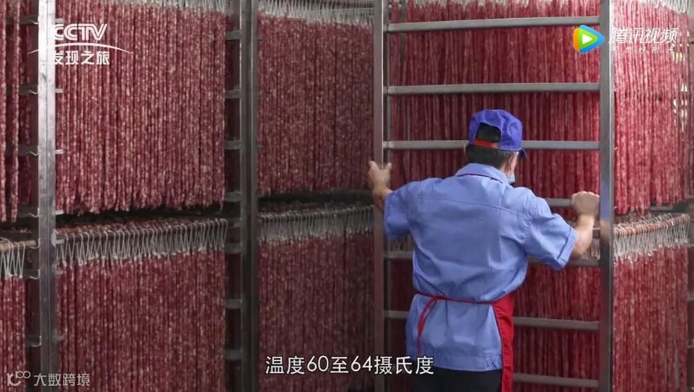香肠装入烘干房后需要进行预热,在预热的两小时内,温度快速升至64℃-68℃,预热也是一个发酵的过程,以控制肉不变色,不变味。