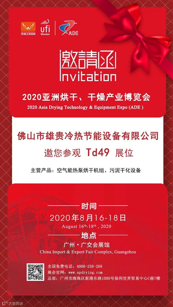 佛山市雄贵冷热节能设备有限公司将精彩亮相于2020年8月16-18日在广州-中国进出口商品交易会展馆隆重举办的2020亚洲烘干、干燥产业博览会,亚洲热泵技术及设备展(AHP)的 Td49 展位。欢迎全球各专业买家光临参观、洽谈合作。