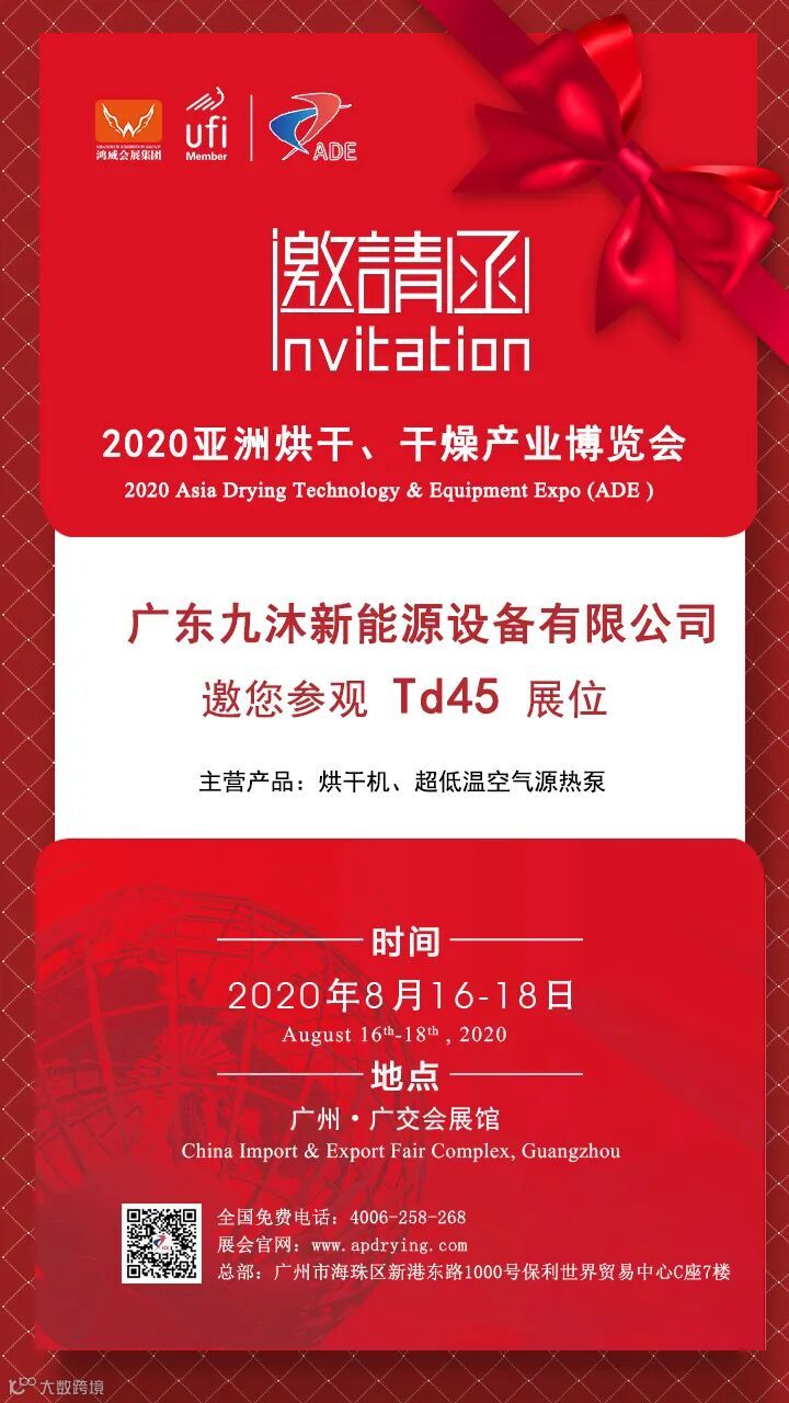 广东九沐新能源设备有限公司将精彩亮相于2020年8月16-18日在广州-中国进出口商品交易会展馆隆重举办的2020亚洲烘干、干燥产业博览会,亚洲热泵技术及设备展(AHP)的 Td45 展位。欢迎全球各专业买家光临参观、洽谈合作。