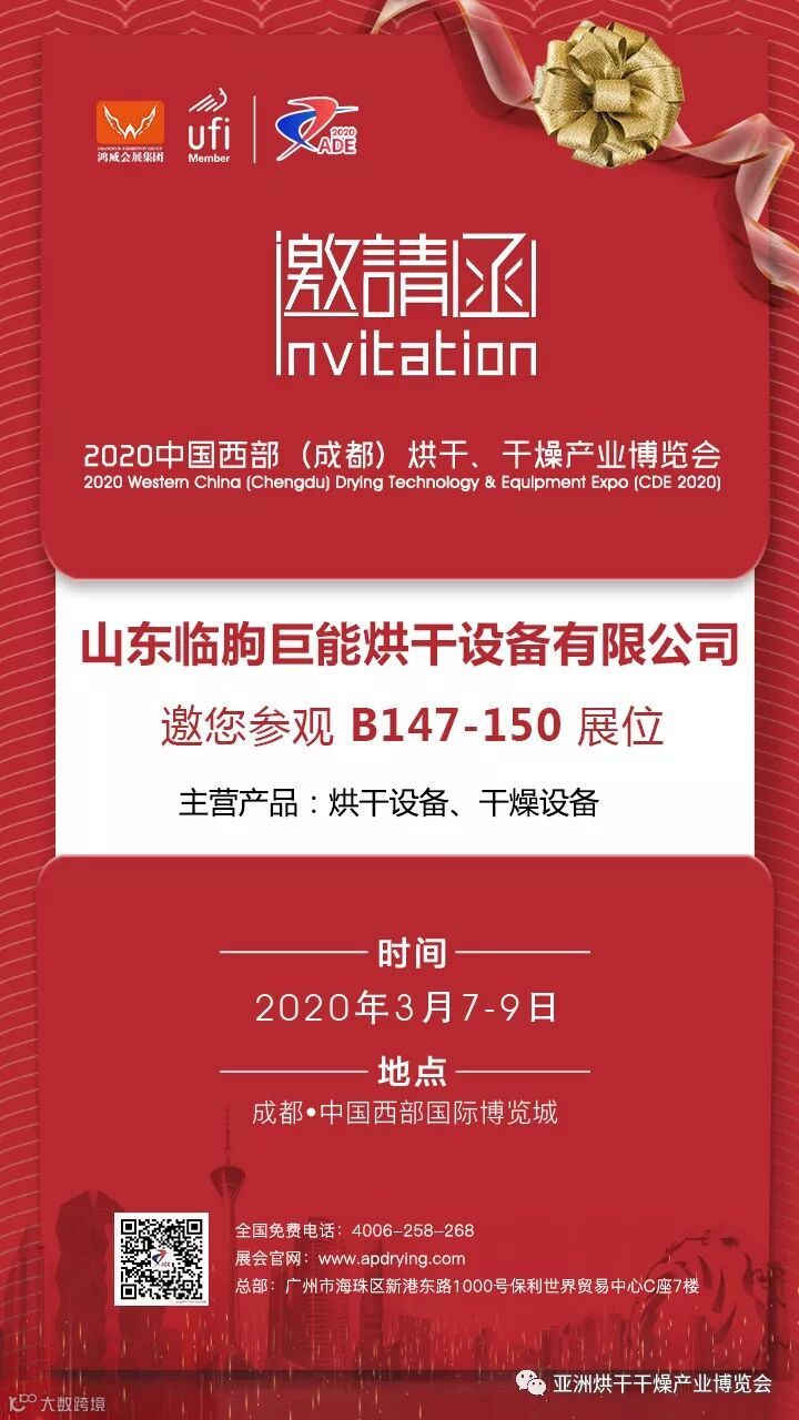 山东临朐巨能烘干设备有限公司将精彩亮相于2020年3月7日-9日在中国西部国际博览城隆重举办的2020中国西部(成都)烘干、干燥产业博览会的B174-150展位。欢迎全球各专业买家光临参观、洽谈合作。
