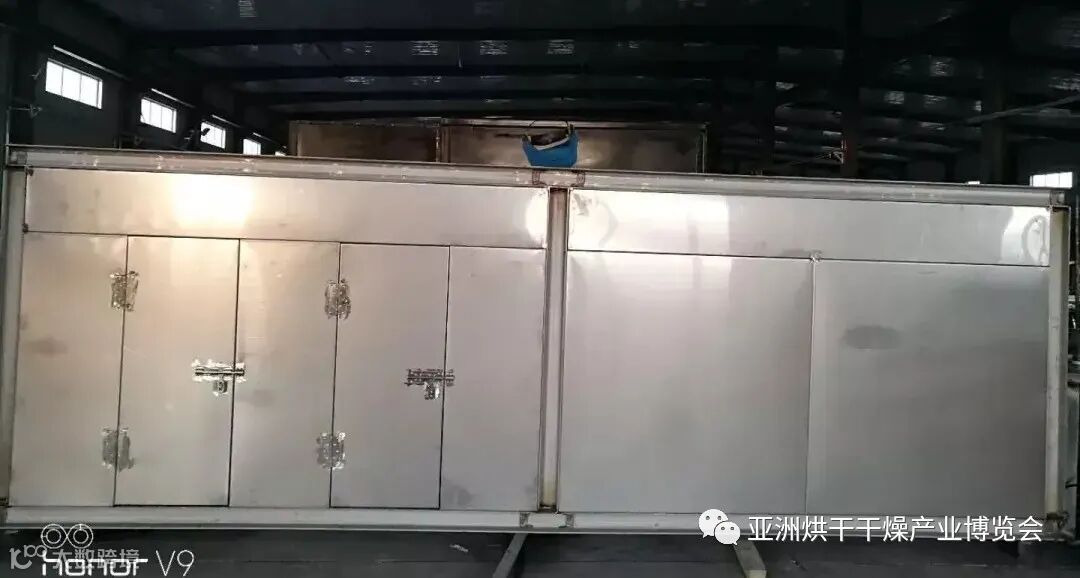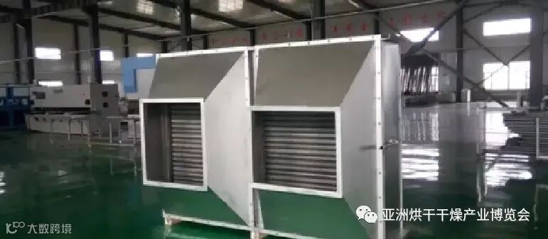 带热回收设备的烘干工艺,热回收设备能利用排风的高温能量对常温新风进行预热,烘干箱内排出的高温高湿空气(湿热排风)先经过热交换器后再排掉,常温新风先经过热管再送入烘房,这两股空气在热交换器内部进行热量交换,由于两股空气完全隔离,排风的湿气不会混入新风,新风吸收排风的热量后温度会大幅上升,排风在与新风热量交换后温度也会下降,随后排出到室外环境中。由此,新风经热交换后温度会显著升高,再通过加热装置加热新风,可大幅减少将新风加热到烘干箱所需温度的能耗。