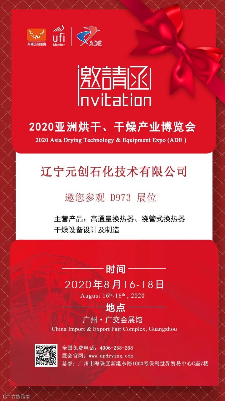 辽宁元创石化技术有限公司 将精彩亮相于2020年8月16-18日在广州-中国进出口商品交易会展馆隆重举办的2020亚洲烘干、干燥产业博览会,亚洲热泵技术及设备展(AHP)的 D973 展位。欢迎全球各专业买家光临参观、洽谈合作。