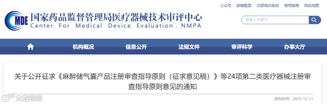 根据国家药品监督管理局医疗器械注册审查指导原则项目计划的有关要求,我中心组织编制了《麻醉储气囊产品注册审查指导原则(征求意见稿)》等24项第二类医疗器械注册审查指导原则(附件1),现已形成征求意见稿,即日起在网上公开征求意见。如有意见和建议,请填写意见反馈表(附件2),并于2026年1月9日前反馈至相应的联系人(附件3)。