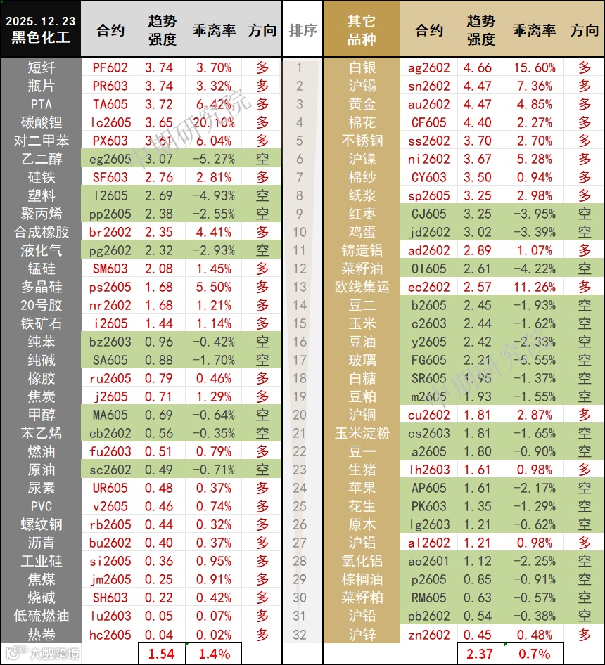 中期商品趋势榜 | 红枣、乙二醇空头偏强 白银、沪锡、黄金、棉花多头强势(1223)