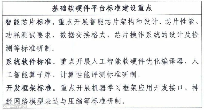 2.系统软件标准。规范人工智能软硬件优化编译器、人工智能算子库、人工智能软硬件平台计算性能等,促进软硬件平台的协同优化。