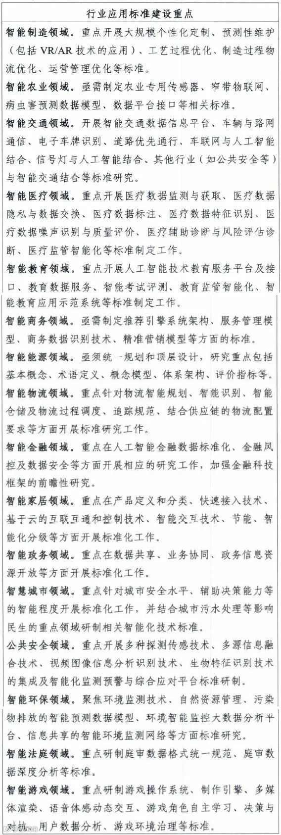 到2023年,初步建立人工智能标准体系,重点研制数据、算法、系统、服务等重点急需标准,并率先在制造、交通、金融、安防、家居、养老、环保、教育、医疗健康、司法等重点行业和领域进行推进。建设人工智能标准试验验证平台,提供公共服务能力。