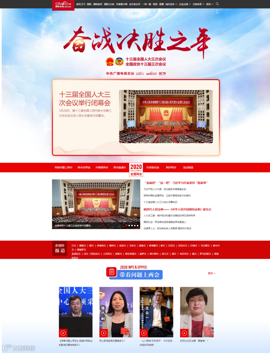 5月20日,国际在线推出2020年全国两会大型专题,以“奋战决胜之年”为主线,集纳俄文网、法文网、西班牙文网、阿拉伯文网等40个语种专题入口,并精心策划推出“大使看两会”“带着问题上两会”“两会世界说”“外媒看两会”“两会直通车”“代表委员说”“网评两会”等特色栏目,紧贴百姓关注的热点话题,突出“外”字特色。