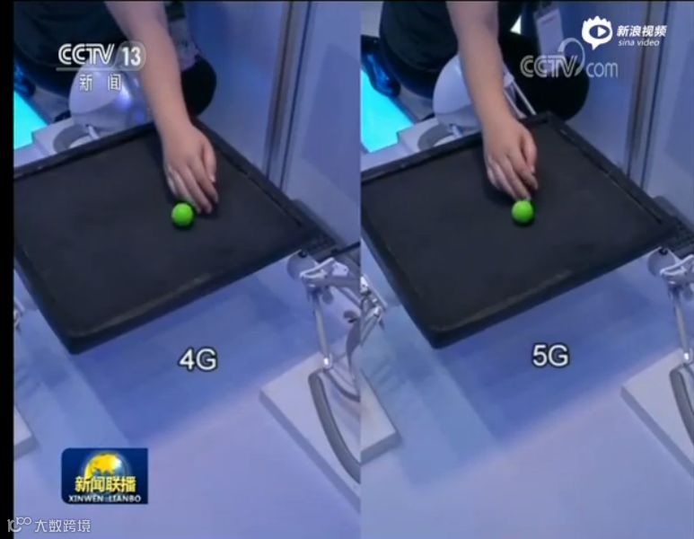这个场景展示的是依托中国联通5G技术超低时延的特性,小球快速回归平衡状态。参展商表示,4G的时延在100毫秒,而5G的时延在10毫秒。