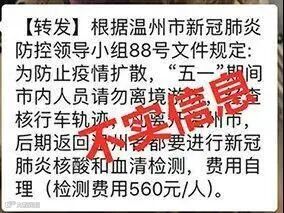 真相:浙江省疫情防控办〔2020〕88号文件要求,各地、各单位要加强重点地区来浙人员的健康管理服务工作,未要求“五一”期间外出返温人员(除重点地区外)进行核酸和血清检测。