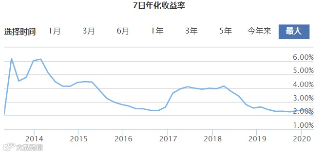 不过,从2018年5月开始,收益率开始持续下滑,截至2020年4月7日,收益首次跌破2%。