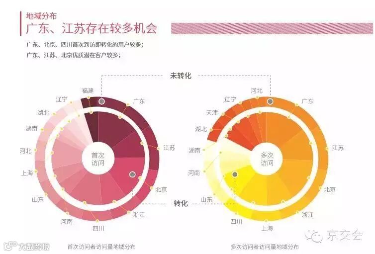 此外,对于美妆行业来说很有参考价值的点也呈现在报告中,在美妆行业中,依据到访次数、是否转化两个指标,将用户到访行为分作4类;通过洞察转化人群与非转化人群、首次到访人群与多次到访人群在地域分布、关注内容等差异,为细分人群精准投放提供参考。根据地域分布,在广东、北京、四川首次到访即转化的用户较多;广东、江苏、北京优质潜在客户较多。