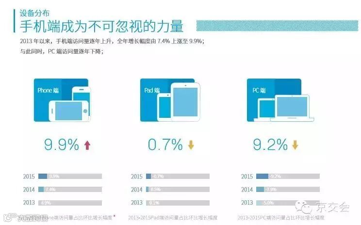 移动互联网的发展让手机端成为不可忽视的主要力量。用户的使用习惯逐渐由PC端向手机端转移,据国双报告显示,2013年以来,手机访问量逐年上升,全年增长幅度由7.4%上升至9.9%,与此同时,PC端访问量逐年下降。但是数据也显示:PC端访问用户整体粘度较高,平均每个页面停留时间较长,手机端平均页面访问数据较高,但跳出率同样较高。另一方面,相对于PC用户阶段性的活动,手机用户全天都保持较高的活跃度。