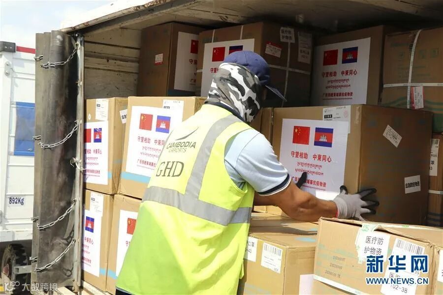 在柬埔寨首都金边,机场工作人员搬运中国援柬医疗物资。中国抗疫医疗专家组一行7人抵达金边国际机场,随机运抵的还有8.1吨中方援助的N95防护口罩、医用外科口罩、医用一次性防护服、红外线体温枪等医疗物资。新华社记者 毛鹏飞 摄