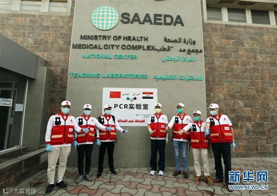 在伊拉克巴格达,中国红十字会总会援助伊拉克防治新冠肺炎医疗专家组成员在实验室前合影。新华社发(哈利勒·达伍德摄)