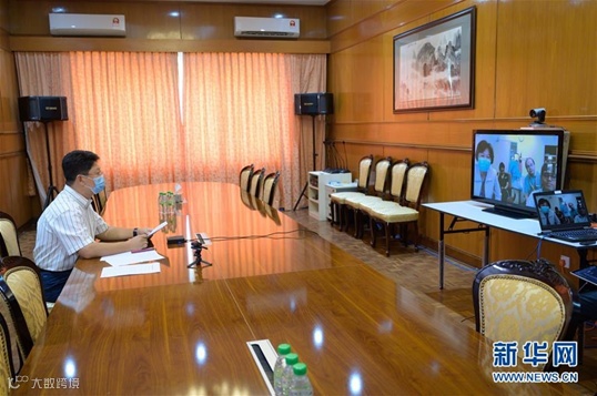 3月26日,在马来西亚吉隆坡,中国驻马来西亚大使白天(左)参加中马两国卫生专家新冠肺炎疫情防控和诊疗经验交流视频会议。新华社记者 朱炜 摄