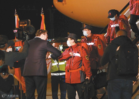 肩负着使命和希望的塞航A330专机平稳落地,舱门开启,在众人热烈的掌声中,中国援助塞尔维亚抗疫医疗专家组一行6人走下飞机。武契奇快步走到舷梯旁,与专家组成员“碰肘”致意。