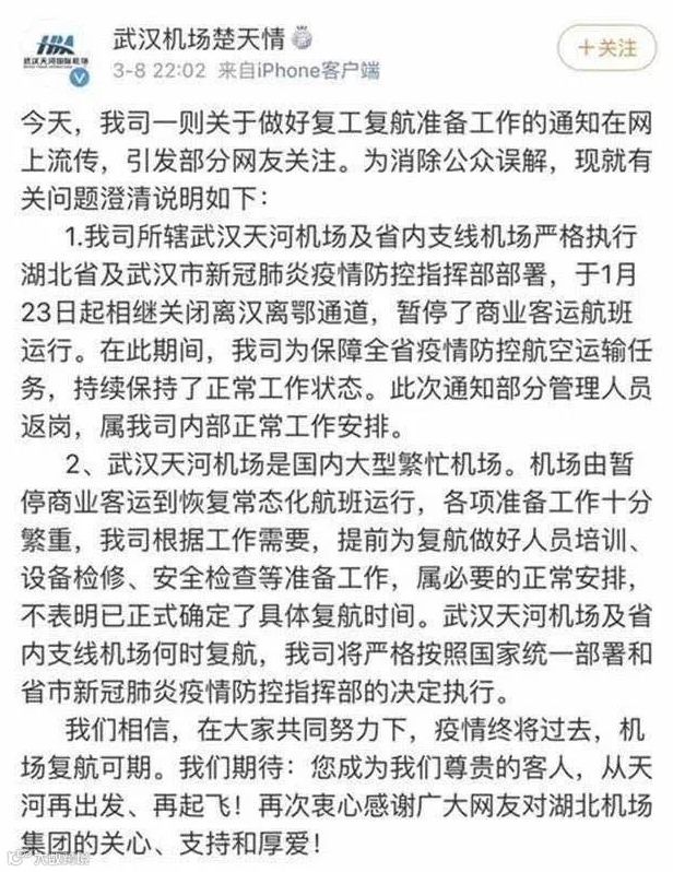 武汉天河机场官方微博回复称,武汉天河机场从暂停商业客运到恢复常态化航班运行,各项准备工作十分繁重,发布本次通知属于必要的正常安排,不表明已确定具体的复航时间。