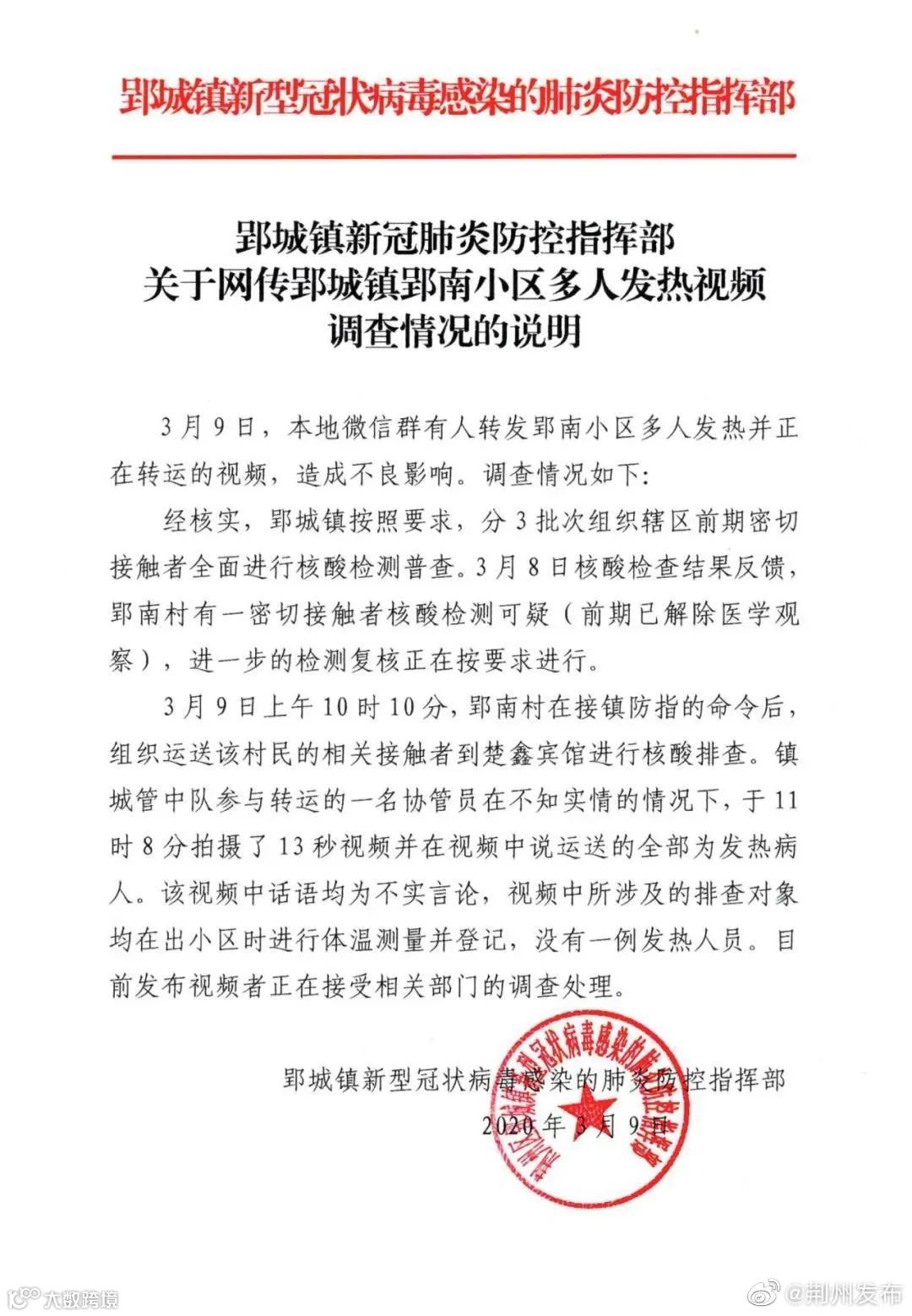 近日,在湖北省荆州市郢城镇当地网民的微信群中流传一段视频,视频称“郢城镇郢南小区多人发热并正在转运”。